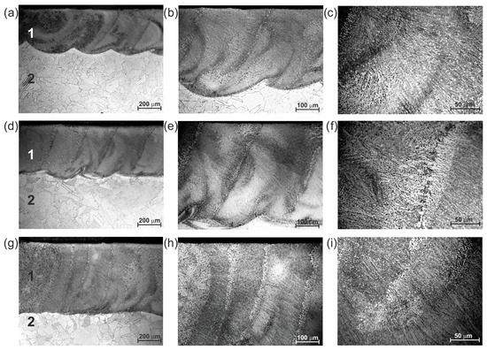 OM image of the cross-sections of the laser borided layers produced on Nimonic 80A alloy arranged as multiple tracks by using different laser beam power: (a–c) 1.3 kW; (d–f) 1.56 kW; (g–i) 1.95 kW. 1—laser re-melted layer; 2—substrate material (Nimonic 80A alloy).
