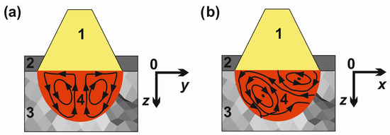 Schematic representation of the direction of convection and vortex motions in a molten pool: (a) in the z0y cross-section perpendicular to the direction of the laser beam movement, (b) in the z0x cross-section parallel to the direction of the laser beam movement. 1—laser beam, 2—pre-coated paste with amorphous boron, 3—substrate material (Nimonic 80A alloy), 4—molten pool.