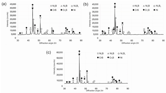 XRD patterns Nimonic 80 alloy after laser boriding at laser beam power of (a) 1.3 kW, (b) 1.56 kW, and (c) 1.95 kW.