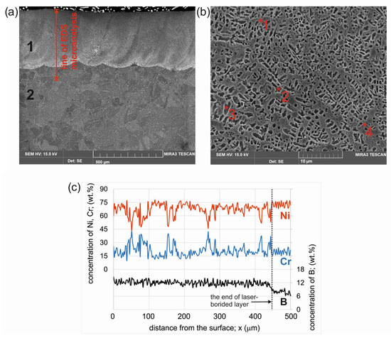SE image of the cross-sections of the laser borided layers produced on Nimonic 80A alloy using different laser beam power of 1.56 kW: (a) entire layer and substrate view; (b) details of the microstructure in the re-melted zone with EDS microanalysis points marked; (c) the results of linear EDS microanalysis; 1—re-melted zone (laser borided layer); 2—substrate material (Nimonic 80A alloy); *1, *2, *3, *4 — measuring points for EDS microanalysis.