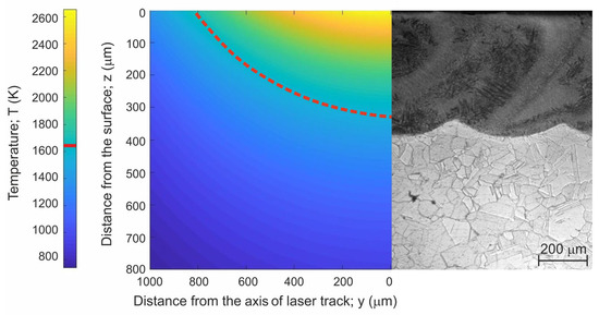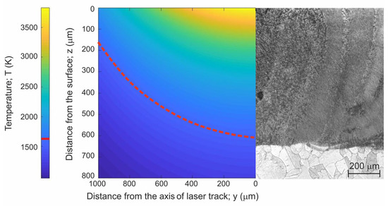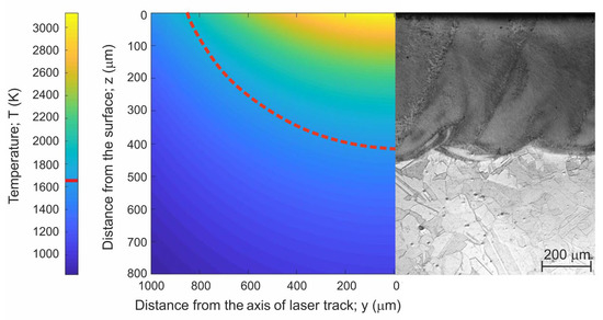 On the basis of Equation (2), a model of a 2D cross-section through a single laser track was prepared. This 2D cross-section presented temperature distribution in the molten pool. The molten pool boundary was determined based on the melting point of Nimonic 80A alloy. The prepared 2D cross-sections were compared with the experimentally obtained laser re-melted layers produced on Nimonic 80A alloy (Figure 9, Figure 10 and Figure 11). The comparison of the modeled depth of the re-melted layer with the experimental results is presented in Table 3.