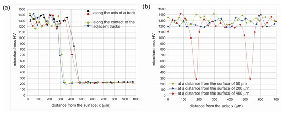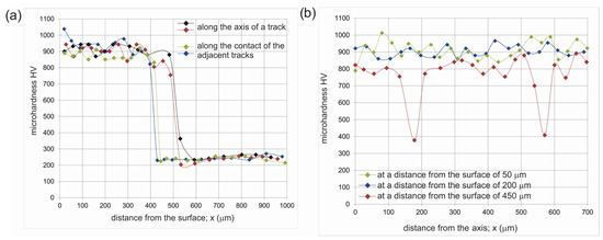 The microhardness profiles of laser borided layer produced on Nimonic 80A alloy at the laser beam power of 1.95 kW: (a) measurements along the axis of a track and along the contact of the adjacent tracks; (b) measurements along the straight line parallel to the surface.