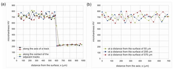 In the case of measurements carried out at a distance from the top surface corresponding to the bottom of the laser tracks, in the areas of contact of the adjacent tracks, the lower hardness was obtained, but only in the case of laser beam power of 1.3 kW and 1.56 kW. For the layer produced at P = 1.3 kW, the differences between the depth of the re-melted layer measured in the axis of the laser track and at the contact of the adjacent tracks were the highest; therefore, the Vickers indents carried out at the contact of the adjacent tracks were performed entirely in the substrate material. This resulted in a hardness of less than 300 HV (Figure 12b). The increase in laser beam power to 1.56 kW caused the formation of a more uniform laser borided layer with respect to the thickness; therefore, the Vickers indents carried out at the contact of the adjacent tracks were performed partially in the substrate material and partially in the re-melted zone. This resulted in a hardness of 400 HV (Figure 13b). The high uniformity of thickness of the laser borided layer produced at the highest laser beam power of 1.95 kW was the reason for the high hardness measured at a distance corresponding to the bottom of the laser tracks, even at the contact of the adjacent tracks (Figure 14b).