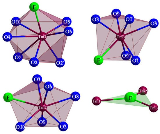 (Si2–O7–Si3) = 138°). In the unit cell, the opening of the [Si3O10]8− horseshoes is arranged alternatingly to the left and the right (Figure 4) along the [010] direction. The Si–O distances with values of 160–165 pm match very well with the distances of the two known types of thulium oxodisilicates (e.g., B-type Tm2Si2O7: d(Si–O) = 160–165 pm [30] or C-type Tm2Si2O7: d(Si–O) = 161–164 pm [31]). The triangular, almost planar, isolated [FTm3]8+ units (d(F–Tm) = 220–235 pm; Figure 5) are located between the [Si3O10]8− chain fragments (Figure 2). The deflection of the F− anion from the (Tm3+)3 triangle amounts to 20 pm and the Tm–F–Tm angles range from 110 to 134°. In the structure, three crystallographically distinguishable Tm3+ cations are found. (Tm1)3+ is surrounded by one F− and six plus one O2− anions in the shape of a distorted square antiprism. The coordination polyhedra of (Tm2)3+ can be described as a strongly distorted monocapped trigonal antiprism, consisting of one fluorine and six oxygen atoms and (Tm3)3+ shows an environment of one F− and six O2− anions arranged as a distorted monocapped trigonal prism (Figure 5). The Tm–O distances with values of 220–268 plus 292 pm correspond excellently with those in thulium oxodisilicates, oxide ortho-oxosilicate or sulfide oxodisilicate, respectively (e.g., B-type Tm2Si2O7: d(Tm–O) = 220–274 + 287 pm [30], Tm2O[SiO4]: d(Tm–O) = 218–250 + 322 pm [32], Tm4S3[Si2O7]: d(Tm–O) = 225–251 + 317 pm [33]). The distances between thulium and fluorine (d(Tm–F) = 220–235 pm) are also in good agreement with the separations in, for example, BaTm2F8 (d(Tm–F) = 222–231 pm) [34] or TmF[AuF4]2 (d(Tm–F) = 212–238 pm) [35]. For visualization of the crystal-structure features, Figure 3, Figure 4 and Figure 5 were created using the DIAMOND [36] program.