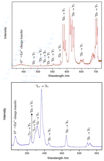 In the Y3F[Si3O10]:Ln3+ phosphors (Ln = Eu, Tb, Er), the doping Ln3+ cations are obviously able to replace all three different Y3+-cation sites. The emission spectrum of Y3F[Si3O10]:Eu3+ detected at 390 nm (Figure 6, top) presents strong peaks due to the 5D0 → 7F2 transition, as well as the peaks for the 5D0 → 7F1 transition. The 7F1 level is split into nine components due to three different sites and the low symmetry for Eu3+ in the crystal structure. The existence of a weak 5D0 → 7F0 peak indicates that only Cn, Cnv or Cs symmetries are possible. The bands for 5D1 → 7FJ transitions were also observed. A weak broad band at 442 nm was detected, which suggests the occurrence of the charge-transfer transition O2–-2p → Eu3+-5d. The excitation spectrum detected at 585 nm (Figure 6, bottom) shows f–f transitions of the Eu3+ cation together with a broad band peaking at 316 nm, which can be assigned again to the O2− → Eu3+ charge-transfer process.