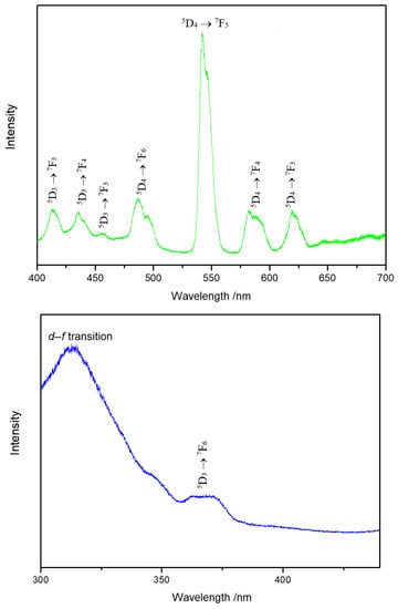 In the emission spectrum of Y3F[Si3O10]:Tb3+ at 370 nm (Figure 7, top), broad bands were detected for the 5D3 → 7FJ and 5D4 → 7FJ transitions. Due to the lot of degeneration possibilities of the f–f transitions, these bands usually appear to be broad. The excitation spectrum of Y3F[Si3O10]:Tb3+ detected at 485 nm (Figure 7, bottom) shows the 5D3 → 7F6 transition of Tb3+ together with an obvious strong broad band, which results from the allowed transition from the 4f8 to the 4f75d1 configuration.