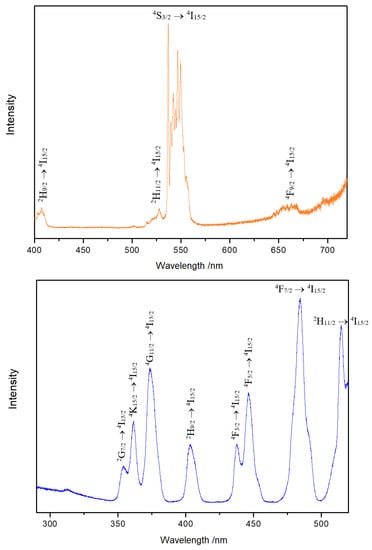 A large number of bands between 536 and 550 nm were detected for 4S3/2 → 4I15/2 in the emission spectrum of Y3F[Si3O10]:Er3+ at 375 nm (Figure 8, top). The excitation spectrum (Figure 8, bottom) recorded at 536 nm shows strong peaks due to f–f transitions. This indicates that the luminescence of Er3+ is almost exclusively owed to f–f transitions of the Er3+ cations.