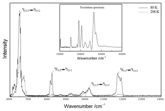 Figure 9 shows that Y3F[Si3O10]:Er3+ also offers infrared emission bands, the strongest at 850 nm (≡ 11765 cm−1), 1000 nm (≡ 10000 cm−1), 1200 nm (≡ 8333 cm−1) and 1500 nm (≡ 6667 cm−1), which can be attributed to 4S3/2 → 4I13/2, 4I11/2 → 4I15/2, 4F9/2 → 4I13/2 and 4I13/2 → 4I15/2 transitions, respectively. However, this special kind of Er3+ IR-luminescence seems more suitable for living tissue probing [37] than for lighting applications.