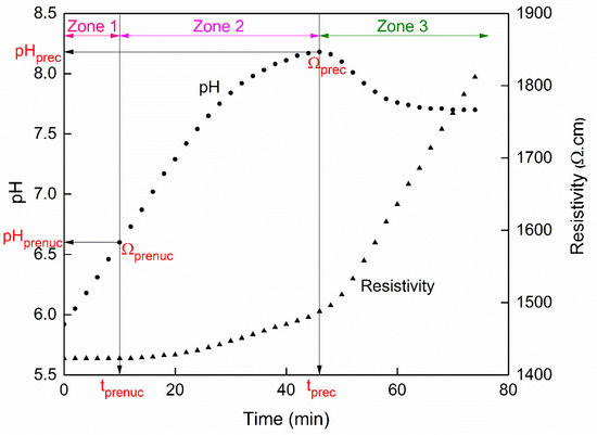 Figure 2 represents a model of an FCP test reporting the evolution of pH and resistivity as a function of time of PCCW throughout the crystallization procedure. The figure emphasizes the limit between three different zones of precipitation. During zone 1, the resistivity is roughly constant and pH values increase up to reach the prenucleation pH “pHprenuc” at tprenuc. In zone 2, the pH continues rising up with a small change in the resistivity variation speed before precipitation time “tprec”. The medium is considered to be supersaturated, and calcium carbonate precipitation is thermodynamically possible. In zone 3, the slope of the resistivity temporal evolution diverges significantly, which highlights the precipitation beginning. After attaining the precipitation threshold at “pHprec”, the pH decreases considerably. Therefore, the precipitation is rapid and followed by a crystal growth stage.