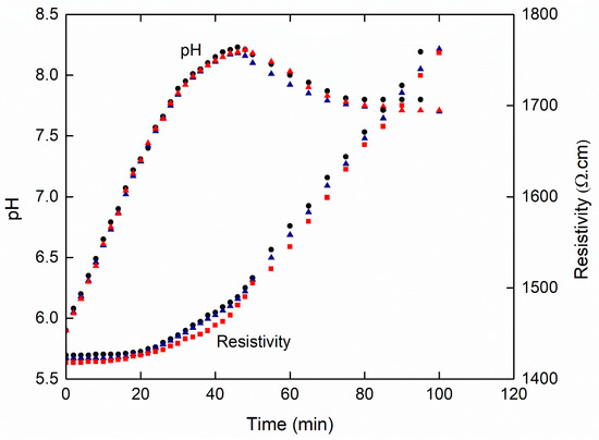 Temporal evolution of pH and resistivity curves of a PCCW 400 mg L−1 at 30 °C, 800 rpm.