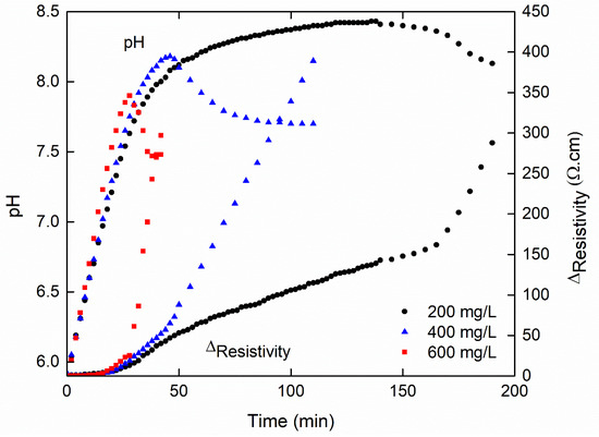 The calcium carbonate concentrations vary in natural waters in a range of 100 to 600 mg L−1. Examples include geothermal water (100 mg L−1), tap water (200 to 400 mg L−1), and saline water (600 mg L−1) [37]. Therefore, three solutions with different dissolved CaCO3 content levels (200, 400, 600 mg L−1) were prepared to study the effect of initial calcium carbonate amount on the nucleation threshold. Figure 4 reports the temporal evolution of pH and ΔResistivity curves during the FCP tests by varying the initial concentration of calcium carbonate. The main results are presented in Table 1.