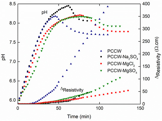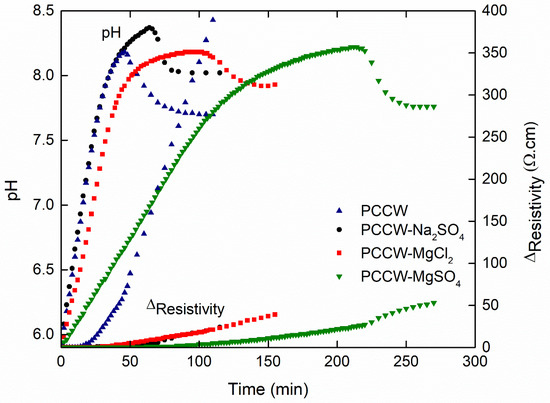The most abundant salts found in natural waters are MgCl2, Na2SO4 and MgSO4. Their effect on the nucleation process of CaCO3 will be investigated. The results of FCP tests obtained in PCCW-MgCl2, PCCW-Na2SO4 and PCCW-MgSO4 solutions are compared to the results of PCCW solution. The pH and resistivity time curves are represented in Figure 5 and Figure 6.