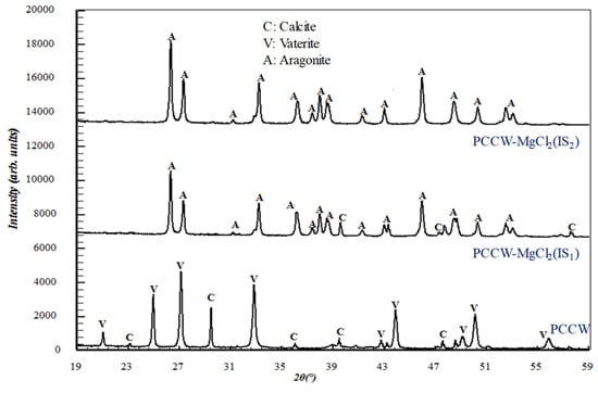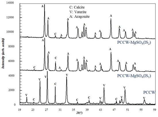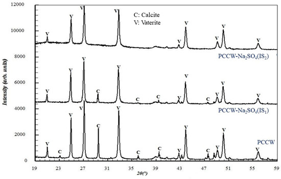 The effect of foreign salts addition on the solid precipitate was studied. At the end of each FCP experiment, the precipitate obtained was characterized using the X-ray diffraction analyses. Figure 7, Figure 8 and Figure 9 present, respectively, the XRD patterns of the precipitate obtained in the absence and presence of MgCl2, Na2SO4 and MgSO4 for IS1 and IS2. CaCO3 precipitated in the PCCW is mainly vaterite, with a little fraction of calcite. The formation of these calcite crystals is inhibited when Mg2+ ions (from IS1) and SO42− ions are separately added (Figure 7 and Figure 8). Nevertheless, the presence of Mg2+ promotes the aragonite (Figure 7), while SO42− has no effect and vaterite remains the main CaCO3 polymorphous (Figure 8). The action mode of magnesium ions can be by (i) the substitution of calcium ions, or (ii) the insertion in or (iii) adsorption on the CaCO3 lattice [45]. If substitution or insertion leads to magnesian calcite, the adsorption at the earlier stage of nucleation and growth affects the CaCO3 crystalline structure, which is the most probable action mode for our case. Indeed, the interactions between Mg and CaCO3 nuclei are strong because they are improved by electrostatic interactions [46]. Moreover, Mg2+ competes with Ca2+ due to having the same charge, which favors the magnesium adsorption on the surface of calcite and vaterite [47]. The amount of Mg2+ being adsorbed onto CaCO3 crystal active growth sites can be influenced by the precipitation rate and the local solution chemistry [22]. In the presence of MgSO4 at IS1, the vaterite is completely transformed into aragonite (Figure 9) as for the precipitate obtained in MgCl2-solution (Figure 7). This confirms the role of magnesium ions in favoring the aragonite instead of vaterite. However, at such IS and in the presence of SO42−, Mg2+ ions could not inhibit the crystallization of the calcite form (Figure 9). By increasing the ionic strength (IS2) in the case of MgSO4, calcite is gradually inhibited.