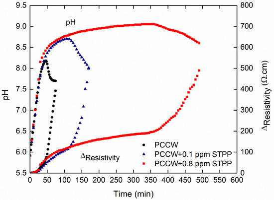 Figure 10 and Figure 11 report the temporal evolution of pH and ΔResistivity as a function of RPI and STPP antiscalants amount. They show that the presence of both antiscalants RPI and STPP significantly influences the kinetics of the nucleation process. Indeed, tprenuc increased from 12 min for PCCW to 20 min in the presence of 4 ppm RPI and 0.8 ppm STPP, as seen in Table 3. During this time, the resistivity remained invariable corresponding to the prenucleation threshold limit. In addition, the increase of the antiscalant amount added to PCCW led to a higher precipitation time. In addition, STPP greatly delayed the precipitation of CaCO3 compared to RPI. In fact, tprec increased from 46 to 210 min and to 365 min for 4 ppm RPI and 0.8 ppm STPP, respectively. Furthermore, the duration of the stable nuclei formation (Δt = tprec − tprenuc) was longer as the antiscalant amount was larger. Therefore, the distinction between the prenucleation and precipitation thresholds became easier. Moreover, the prenucleation threshold was always attained at Ωprenuc values less than 7. Conversely, the precipitation threshold was reached at very high Ωprec, especially after adding STPP to PCCW solution, which went up to 353 at 0.8 ppm. Consequently, both antiscalants affected the kinetics and thermodynamics of calcium carbonate prenucleation and precipitation with different manners.