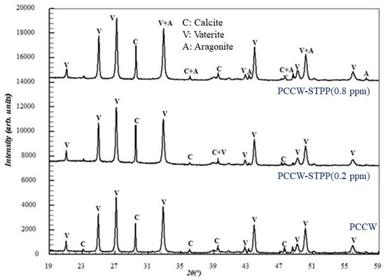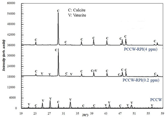 The X-ray diffraction patterns of the precipitate formed in the presence of RPI and STPP are presented in Figure 12 and Figure 13. The patterns of deposit scale obtained in PCCW reveal the formation of calcite with majority vaterite. After the addition of 4 ppm RPI, the crystallization was orientated towards the formation of calcite and to the complete inhibition of vaterite. In the presence of 0.8 ppm STPP, the phases formed remained vaterite and calcite, with the appearance of a new aragonite phase. Consequently, the two antiscalants acted on the CaCO3 precipitation in different ways. XRD characterizations proved that the presence of antiscalant can affect the morphology and the crystal shape of calcium carbonate [48].