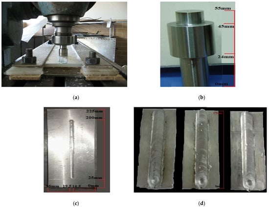 In this work, the most common approach for creating composite aluminum surfaces—groove filling FSP—was used. A groove with the dimensions (175 mm length, 3 mm width, and 2 mm depth) was created using a milling machine. The masses of each TiO2 nano-powder (0.2 g), B4C (0.2 g), and Gr (0.2 g) were determined using an electronics balance to ensure that each nano-powder integration into each workpiece was uniform. Figure 1a–c shows the FSP machine, FSP tool, and the placement of TiO2, or B4C, or Gr nano-powder in their groove on three different AA 7075 substrate materials.
