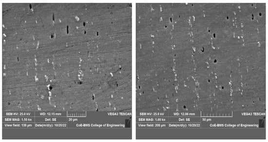 Figure 8 and Figure 9 display the typical SEM images of the manufactured AA7075/Gr surface composites. These figures show that the Gr particles were not evenly distributed throughout the AA7075/Gr composite, which was produced at 800 rpm rotational speed. In the composites, there was particle accumulation. The typical SEM images of AA7075/Gr surface composites, produced at 1400 and 2000 rpm, indicate that the graphene particles were distributed uniformly throughout the matrix and that they were firmly attached inside them to create a sizable interface.