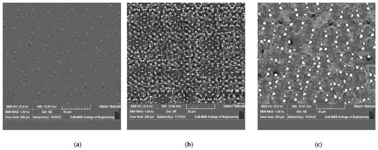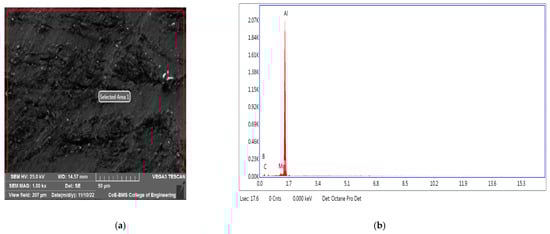 For both the friction stir-treated base metals and the specimens, specimens were sectioned perpendicular to the processing direction. Using a disk grinder, samples were planar ground at different grits, from coarse to fine. These grits included 300, 600, 800, 1000, 1200, and 2000 mm. Diamond paste with a 3 μm thickness was used for rough polishing on velvet pads. With a 0.05 μm Alumina solution, fine polishing was carried out with micro-cotton pads. Using Keller’s reagent, the sample specimens were chemically etched. The samples were extensively cleaned to remove the carbon deposits, then dried for more microstructural research. The results of microstructural testing on the FSPed specimens containing reinforcing particles were obtained using a scanning electron microscope (SEM) (VEGA 3 TESCAN, Brno—Kohoutovice, Czech Republic).