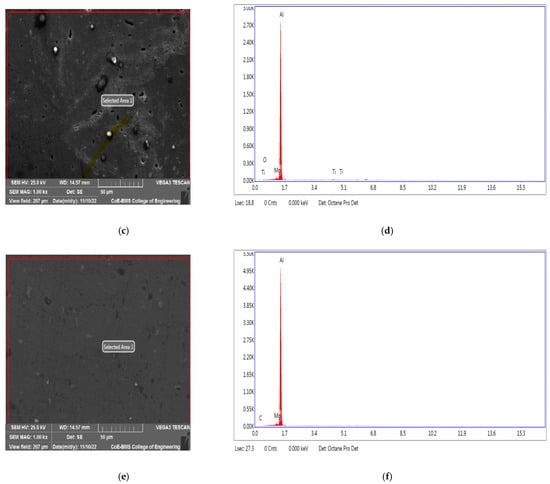 XRD analysis of (a) selected area and (b) EDAX of AA7075/n-B4C; (c) selected area and (d) EDAX of AA7075/n-TiO2; (e) selected area and (f) EDAX of AA7075/n-Gr.