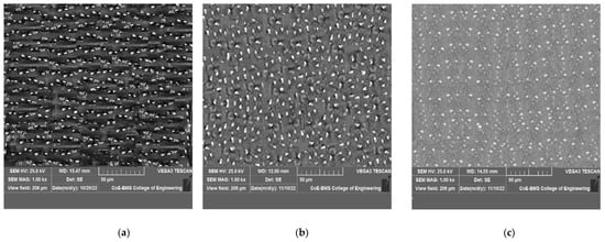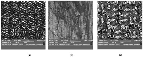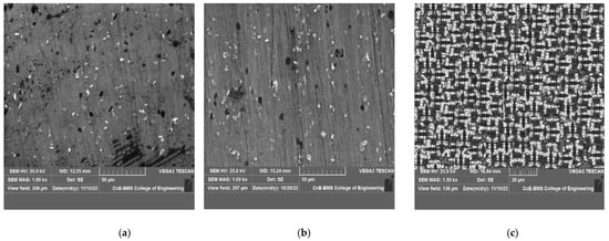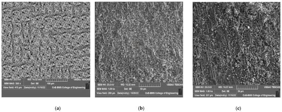 SEM images of the FSPed specimens with B4C made at feed rates of 25–45 mm/min and rotating speeds of 800–2000 rpm are shown in Figure 6a–c and Figure 7a–c, respectively. The FSPed specimen’s cross-section revealed no flaws or porosities, but there was some aggregation of B4Cparticles, proving that the distribution of the particles in the aluminum matrix was not random. There were relatively few faults apparent in the interface, and it appeared that the surface composite layer was extremely effectively bound to the aluminum alloy AA7075 substrate.