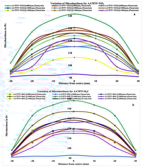 When compared to the other two reinforcements, the micro-hardness of the AA7075/B4C surface composite improved the most among the three, which may be attributed to the hardness of the B4C particles. Figure 9 displays the micro-hardness measurements of the FSPed specimens at feed rates of 25–45 mm/min and four different rotational speeds (800, 1000, 1400, and 2000 rpm). The micro hardness levels tend to decrease as the rotating speed increases. This is due to improved dynamic recrystallization caused by the more aggressive stirring of the tool with a pin. Figure 9 also shows that specimens processed at 1400 rpm were harder than specimens processed at 800, 1000, and 2000 rpm. The specimen that was FSPed at 1200 rpm had consistently sized TiO2 particles, and the average particle spacing was quite good.