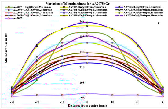 The average value for base metal’s hardness was 100 HV, while the average value for an FSPed specimen without particles was 104 HV. Figure 10 shows, at various rotational speeds and feed rates, the micro-hardness profiles of the AA7075/B4C, AA6063/TiO2, and AA7075/Gr surface composites. An excellent dispersion of the graphene particles in the aluminum matrix is also shown by the fact that the micro-hardness of the treated zones is much higher than that of the unprocessed zones when compared to the aluminum matrix AA7075. Even if the particles are evenly distributed throughout the matrix after two FSP passes, the quantity of an upward trend is insufficient when compared to base metal and base metal that has been FSPed.