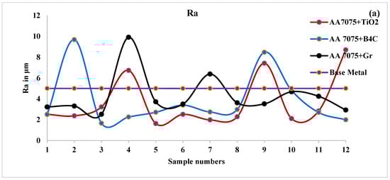 Different profile characteristics, such as Ra (Figure 11a), Rq (Figure 11b), and Rz (Figure 11c), are used to compare the surface roughness of the FSPed AA 7075/TiO2/B4C/ Gr with the FSPed AA 7075. The AA 7075/B4C and AA7075/Gr generated at 800 rpm and 45 mm/min had lower Ra, Rq, and Rz values than the FSPed AA 7075, as shown in Figure 11. Ra, Rq, and Rz values may have decreased as a result of the addition of nanoscale reinforcing particles, which smoothed out the surfaces’ tiny peaks and valleys. The non-homogeneous dispersion of nanoparticles may be the cause of the rise in Ra value. The surface roughness parameters (Ra, Rq, and Rz) used to create the brittle surface regions are different from those used in the other three FSPed composite joints in the stir zone, which displayed partly ductile and partially brittle modes. FSPed joint surface characteristics showed that the advancing side TMAZ was next to the nugget region due to the greater temperature and material flow at this side. Consequently, ductile and brittle fracture always result in the object breaking at the weld zone. The failure mode will likely shift from brittle to ductile as the Ra, Rq, or Rz number of FSPed nanocomposites decreases. This shift in failure mode correlates to a change in the elongation. In addition, as FSPed surface parameters (Ra, Rq, and Rz) are low, which result in a decrease in heat generation and a decrease in the quantity of heat transmitted to this region, the width of the heat-affected area of the weld decreases [25]