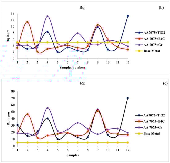 Surface roughness in terms of (a) Ra, (b) Rq and (c) Rz of FSPed AA 7075/TiO2/ B4C/Gr produced by selected processing parameters as compared to FSPed AA7075.