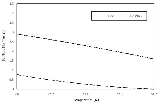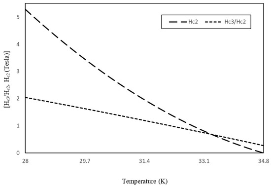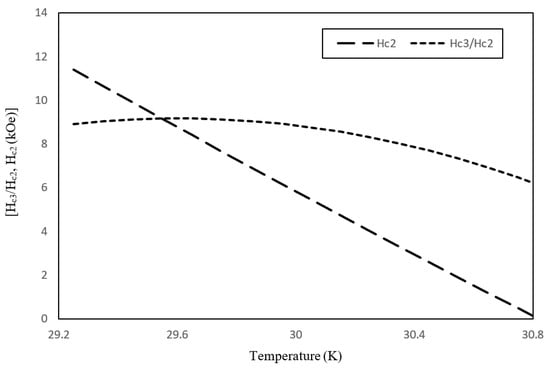 When Equations (13) and (14) are written in matrix form, the result is and when and , respectively, and set , causing a temperature-dependent upper critical magnetic field , as shown in the equation below: