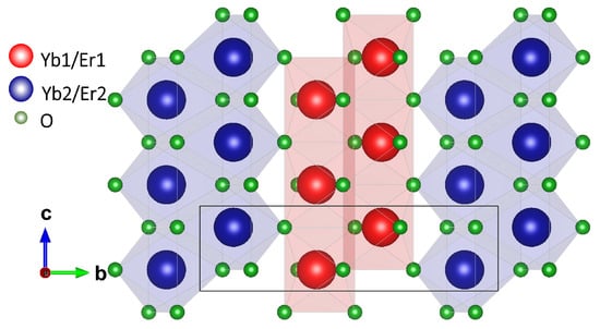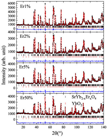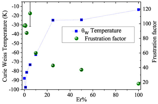 The Curie–Weiss temperatures were extracted from the susceptibility data for temperatures above 250 K; these values are shown in Figure 6. All values are negative, thus indicating the AFM nature of the magnetic interactions for all samples. The Curie–Weiss temperature is clearly reduced when the Er content is increased. However, it is important to notice that, at these temperatures, the susceptibility has contributions from thermally populated Yb CF levels (highest CF for Yb: 930 K and for Er:160 K), thus overestimating the strength of these interactions.