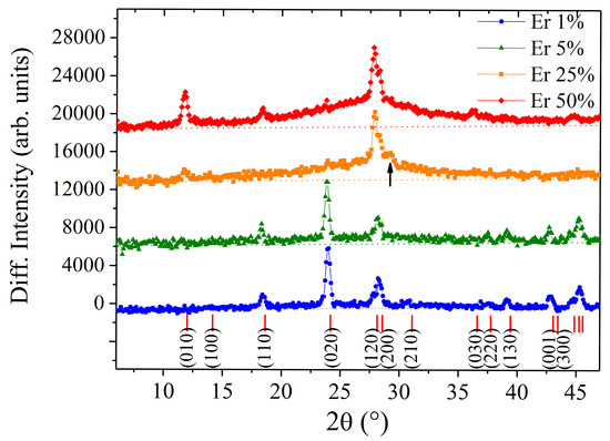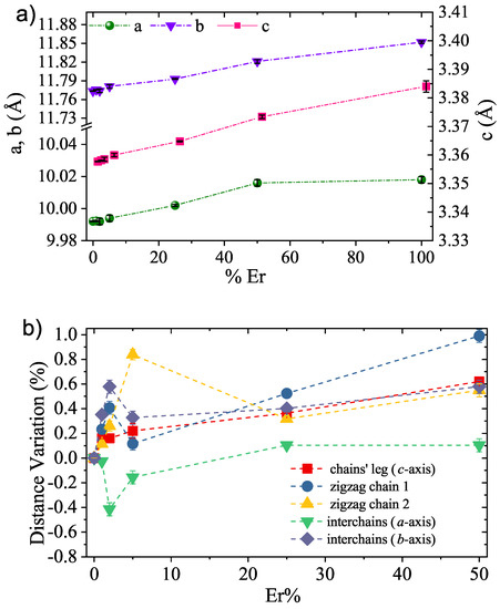 The unit cell expands as more Er is introduced to the structure. The total expansion for Er is of from a total cell volume of from Å [14] to Å. The dependence of the lattice parameters as a function of the Er content is linear as it is shown in Figure 3a.