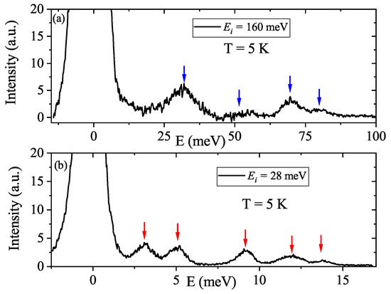 Powder INS spectra measured for the Er are presented as a function of energy transfer (E) in Figure 4a,b. These data were collected at 5 K with incident energies 28 and 160 meV; the presented figure was obtained by integrating the wave–vector transfer dependent data in the range 1–2 Å. In this figure, the crystal field (CF) levels reported for Er in SrErO [13] are marked with red arrows, whereas the levels reported for Yb in SrYbO are marked with blue arrows. This shows that below 28 meV, all the levels correspond to Er (Figure 4b), whereas, above 28 meV, all levels correspond to Yb (Figure 4a). The perfect one-to-one correspondence to the parent compounds CF levels suggest that, within the measured energy and temperature scale, there are no significant effects due to ion substitution.