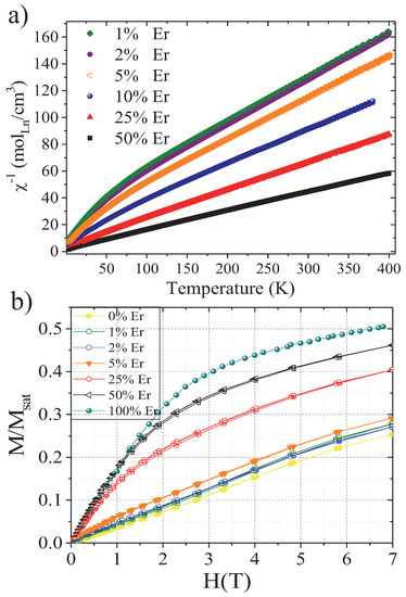 DC magnetic susceptibility has been measured for all samples in two temperature ranges, sub-kelvin regime, and He regime up to 400 K. The high-temperature regime (see Figure 5a) shows a paramagnetic behaviour for all samples. No sign of magnetic transition is seen above 5 K for all samples, and all curves show a paramagnetic behaviour. The DC susceptibility as well as the magnetization measurements as a function of field (see Figure 5b) show that the magnetic moment of each sample increases as a function of the Er content. Such behavior is expected as Er () has a bigger ionic moment than Yb (). Between 2 K and 5 K, there is a change in the DC-susceptibility slope for the 0%, 1%, and 2% of Er. This could be due to short-range magnetic correlations as it has been observed in SrYbO [14].