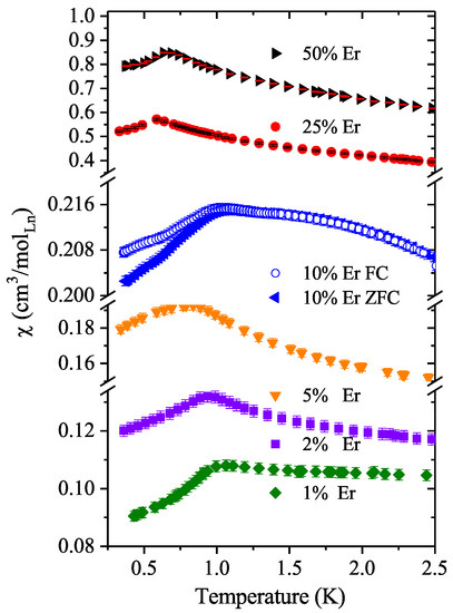 The low-temperature susceptibility data are shown in Figure 7. All samples present magnetic transition-like features below 1 K. Only the samples with 25 and of the Er content present sharp transitions. The features in the susceptibility curve of the samples with lower Er content are much broader, especially the one with Er. This transition could be linked to short-range correlations. All the measurements were collected at zero field cooled (ZFC) and field cooled (FC). A bifurcation between the ZFC and FC susceptibility is only visible for the Er 10% sample starting at 1 K. This behaviour could be linked to a formation of a spin frozen state. Additionally, this sample presents a change in the slope of the susceptibility at 0.55 K; this change could be linked to a lower phase transition due to a re-alignment of the Yb or Er spins.