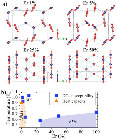 All main results, along with the Néel temperatures are summarized in the phase diagram shown in Figure 9b. There is a critical Yb/Er content linked to a phase transition between the two magnetic structures going through a possible intermediate spin frozen state. Higher values of Er concentration induced a realignment of all moments along the easy axis for Er1, due to its large moment.