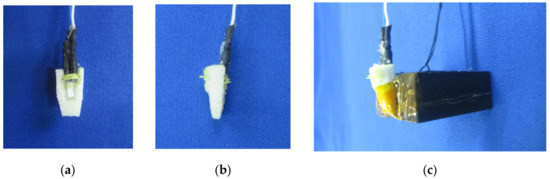 Polyurethane (PUR) shielding was provided to avoid direct contact between the LN2 and the platinum resistor surface area increasing its sensitivity to the YBCO bulk surface temperature. Figure 2a,b show the frontal and lateral views, respectively, of the used platinum resistor with the provided PUR shielding. Figure 2c shows the assembly of this sensor leaning on the YBCO bulk lateral surface.