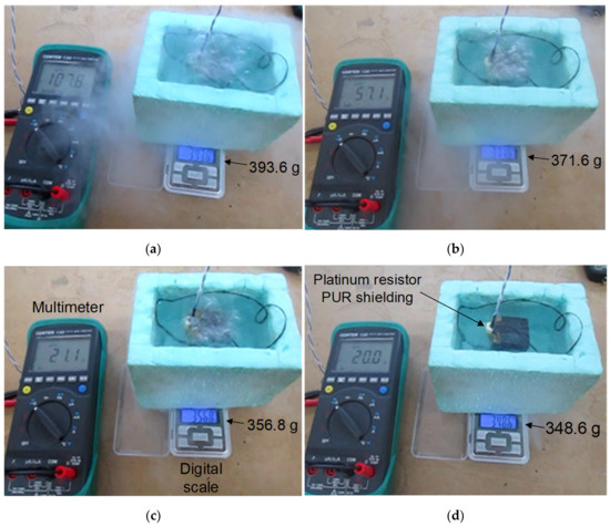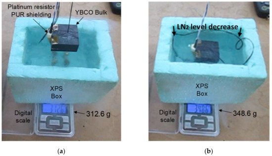 From Figure 3a, related to the instant before immersing the bulk into the LN2, one can see the four thin copper rods fixed at the box cavity bottom below the LN2 level. As one may verify from Figure 3b, the heat released from the YBCO bulk in response to this stepped temperature transition caused LN2 boiling and the consequent reduction of the LN2 level. The amount of heat released from the YBCO bulk was determined from the LN2 evaporated mass, knowing the LN2 latent heat. This is because, in such a stepped temperature transition, the boiling of LN2 was mainly due to the heat released from the YBCO bulk, and the effect of LN2 heating by the room temperature was negligible. The precision of the results is calculated from the rate of LN2 evaporation due to the room temperature heating with the bulk already cooled by ZFC, which was determined in [12].