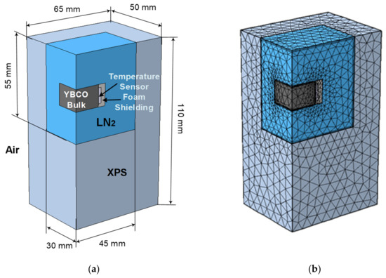 The evolutions of the LN2 evaporated mass, thermal power released from the YBCO bulk, and its average temperature were predicted using 3D FEA. Because of the existing symmetry, only one-quarter of the full box was simulated using 3D FEA to reduce the associated numerical processing. Figure 5a shows the design with dimensions of one box quarter, and Figure 5b shows the mesh considered in 3D FEA.