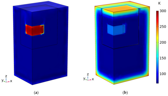 Figure 6a shows the obtained temperature distribution at , when the average temperatures of the YBCO, LN2, and XPS domains were close to their initial values. For the initial conditions, a temperature of was considered for YBCO bulk, platinum resistor, and its foam shielding, and was considered for the LN2 and XPS domains. Figure 6b shows the obtained temperature distribution at when the YBCO bulk average temperature was about . At this time, the level of LN2 had decreased because of LN2 boiling, increasing the temperature at the top air level.