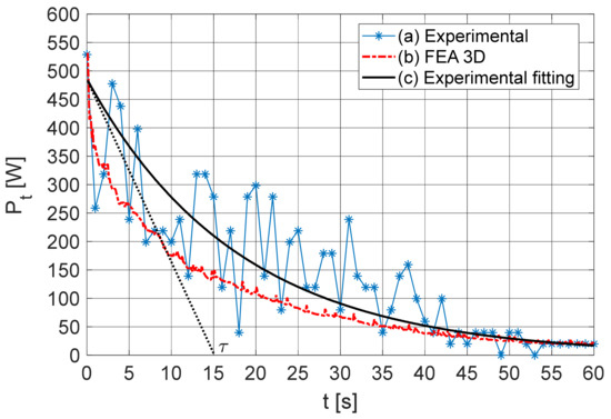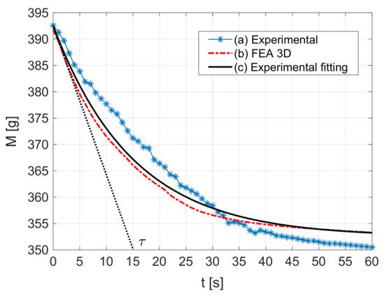 Figure 8 relates to the characteristics of the total mass evolution in time. The mass measured using the digital scale is shown as (a), the data obtained through 3D FEA are (b), and those by the exponential fitting of experimental measurements are shown as (c). Figure 9 shows the characteristics of the evolution of thermal power released from the YBCO bulk in time. Characteristic (a) was obtained by discrete analysis of the total mass evolution measured, as shown in characteristic (a) of Figure 8. This discrete analysis consisted of transforming Equation (27) by Equation (29),