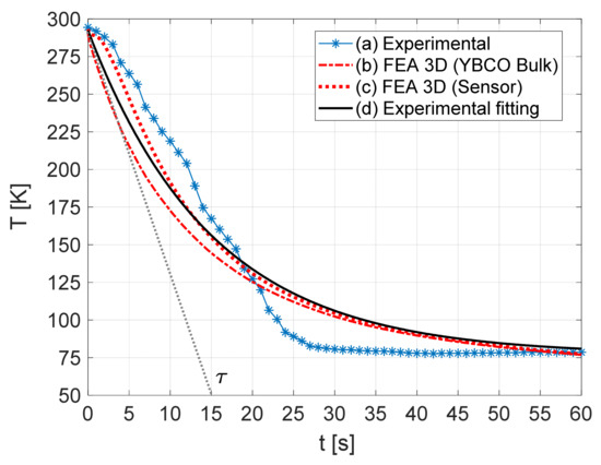 Figure 10 refers to the evolution of the YBCO bulk temperature in time. Characteristic (a) was obtained by the measurement of the platinum sensor resistance and converted into temperature using Equation (28). Characteristics (b) and (c) resulted from the evaluation of the average temperature of the YBCO bulk and platinum resistor, respectively, obtained through 3D FEA. Characteristic (d) was obtained by the exponential fitting of the measured values from experimental characteristic (a).