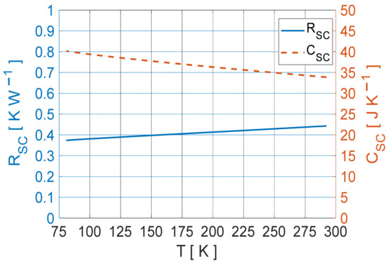 The value of as a function of time was obtained from characteristic (c) of Figure 9. The instantaneous value of the bulk heat capacity was determined by dividing the first-order response time constant by the instantaneous value of the bulk thermal resistance . The characteristics of dependence on temperature, and , were obtained by correlating the obtained characteristics of dependence with time, and , with the dependence of the bulk average temperature in time expressed by Equation (31). Figure 12 shows the obtained characteristics of dependence of the YBCO bulk heat capacity and thermal resistance from its internal average temperature, and .