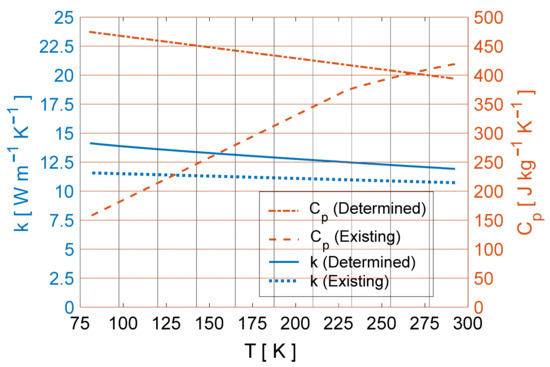 The obtained characteristic of YBCO thermal conductivity (continuous blue line) closely follows the existing one found in the literature [16,17,18] (dotted blue line). Their trends indicate a decrease in YBCO thermal conductivity with temperature.