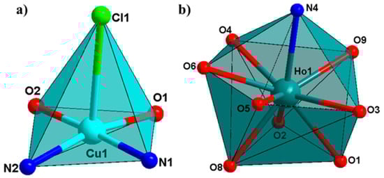 The coordination geometries of Cu(II) (a) and Ho(III) (b) in complex 1.