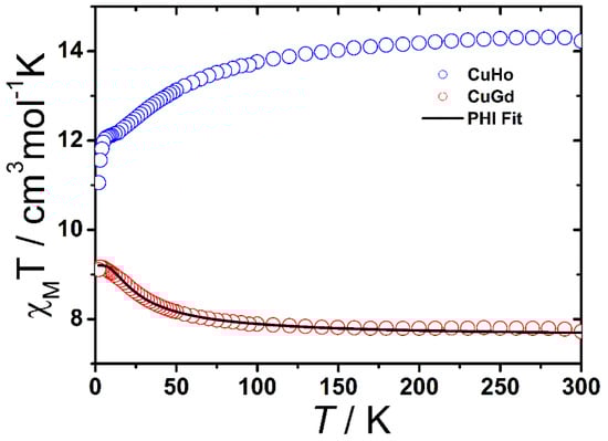 The temperature-dependent magnetic susceptibility data of the polycrystalline complexes 1CuHo-2CuGd were determined in the temperature interval of 2–300 K under an applied direct current (DC) 1000 Oe field. (Figure 4) For the complex 1CuHo, the value of χMT is 14.22 cm3 mol−1 K under room temperature, which is close to the theoretical value 14.445 cm3 mol−1 K. (Cu: g = 2.0, S = 1/2; Ho: g = 5/4, J = 8). Upon cooling from 300 K, the χMT decreases monotonically, which could be attributed to the depopulation of the Zeeman effect and possible weak antiferromagnetic interactions between the spin centers.