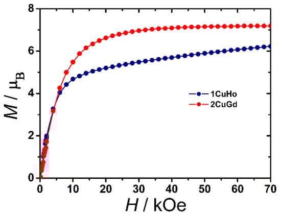 The field-dependent magnetization curves of these compounds at 2 K were measured at the range of 0–70 KOe. (Figure 5). The experimental magnetizations at 7 T are 6.22 and 7.19 μB for complexes 1CuHo-2CuGd, respectively (Table 4). The magnetization value of complex 1CuHo was apparently lower than the saturated magnetization value, which can be explained by the strong magnetic anisotropy of the Ho(III) ion.