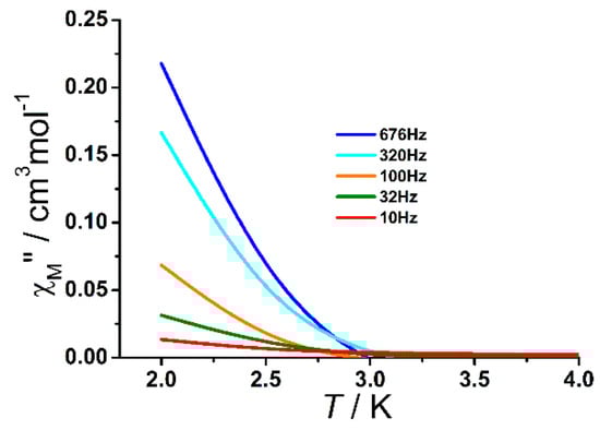 The observation of an out–of–phase χM′′ ac susceptibility signal is one of the important characteristics of an SMM. Thus, alternating current (ac) magnetic susceptibilities were performed in the temperature range of 2.0–6.0 K without the applied DC field at different frequencies to analyse the dynamics of the magnetization of the two complexes. As can be seen from Figure 6, complex 1CuHo exhibited an out−of−phase χM′′ signal below 3.0 K. Although no maximum was observed down to 2.0 K, an obvious frequency dependence of the χM′′ signal was shown to be consistent with the SMM behaviour. It can be seen from Figure S1 that there were no observable out−of−phase signals down to 2.0 K, which rules out the SMM behaviour of complex 2CuGd.