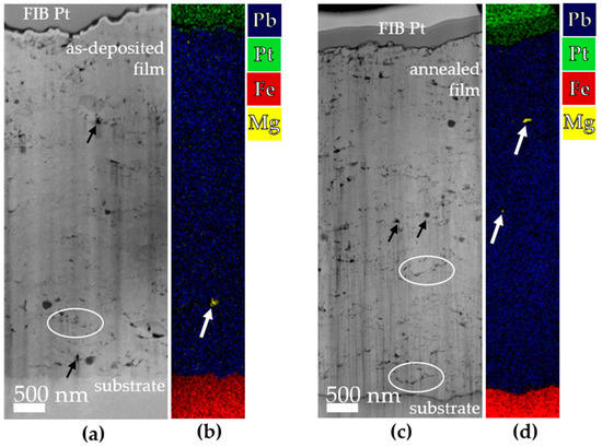 STEM dark-field and EDS analyses, respectively, of the (a,b) the as-deposited film and (c,d) the annealed PMN−10PT thick film. The black arrows on the STEM images (a,c) indicate larger pores in the films, while the circles mark the chain-like defects composed of nanopores. White arrows in the EDS mapping (b,d) mark Mg-rich inclusions in the films. Spectral lines Pb L, Pt M, Fe K, and Mg K were used for the EDS mapping.