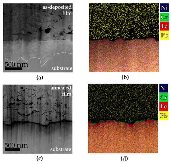 Film-substrate interface in STEM dark-field images and EDS, respectively, of (a,b) the as-deposited film and (c,d) the annealed film. In (a) the dashed line marks the extent of the mechanical deformation observed in the substrate due to particle impact. For the EDS mappings, the spectral lines Ni K, Cr K, Fe K and Pb L were used.