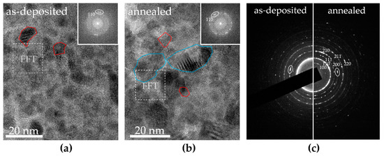 Transmission electron microscopy (TEM) images of grains in: (a) the as-deposited film with the FFT inset of the marked region; and (b) the annealed film (larger and smaller grains are circled in blue and red, respectively), with an inset of the FFT from the marked region. (c) Comparison of the SAED of both films. Circles mark reflections that are indicative of texturing. The Pmm space group was used to index the SAED pattern (PDF#01-074-4513).